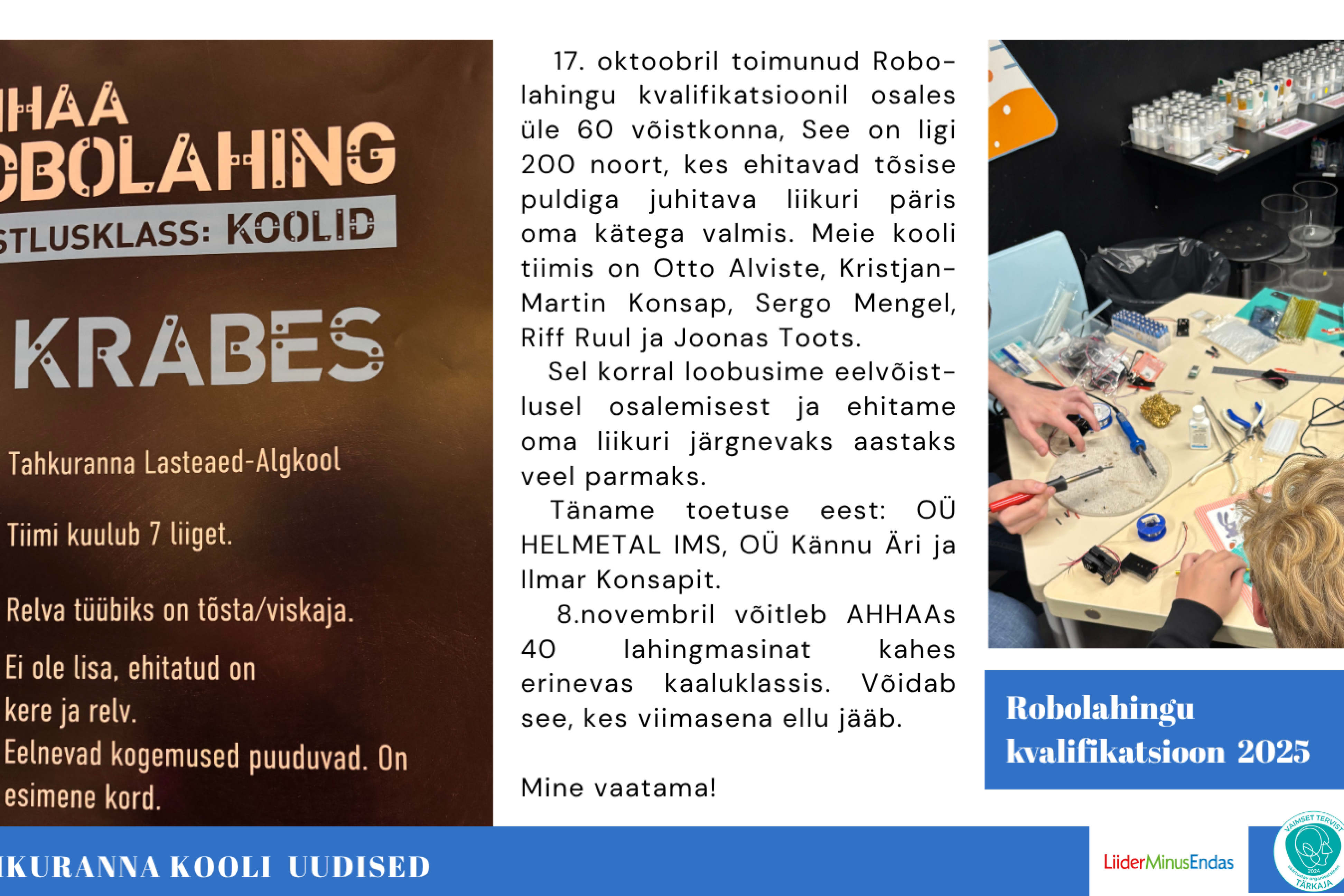 Õpetajate päev lasteaias Loomise kuupäev 03.10.2025 Autor Lasteaed Head õpetajate päeva! Loomise kuupäev 03.10.2025 Autor Kool Pärnumaa Spordiliidu võitluskunstide teemakuu Loomise kuupäev 22.09.2025 Autor Kool Lasteaed 44 Loomise kuupäev 15.09.2025 Autor Lasteaed Vaata rohkem