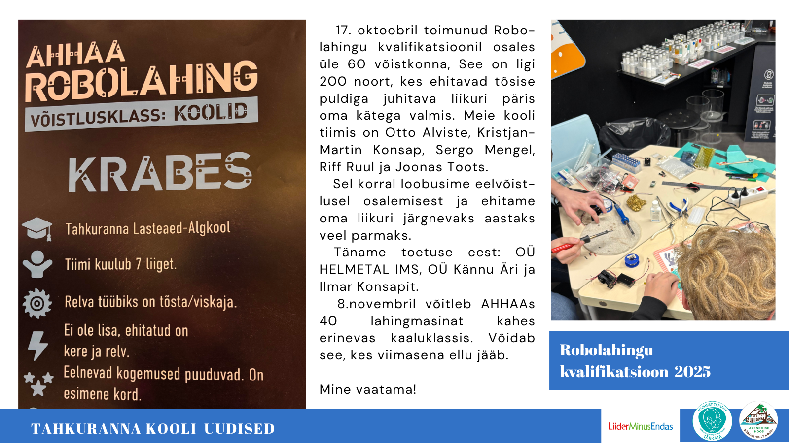 Õpetajate päev lasteaias Loomise kuupäev 03.10.2025 Autor Lasteaed Head õpetajate päeva! Loomise kuupäev 03.10.2025 Autor Kool Pärnumaa Spordiliidu võitluskunstide teemakuu Loomise kuupäev 22.09.2025 Autor Kool Lasteaed 44 Loomise kuupäev 15.09.2025 Autor Lasteaed Vaata rohkem